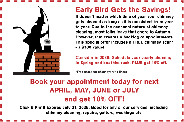 When is the best time to have my chimney cleaned? Spring is the best time of year to have your chimney services done. Once autum arrives, most chimney business are very backed up. Also, you should have your chimney serviced directly after the winter months of heavy usage so dangerous creosote does not sit in your chimney for an extended period of time.